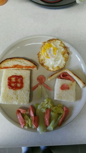 用火腿片和菜断组合成小人儿,鸡蛋放房子上方作太阳。白菜点缀成树和草丛。