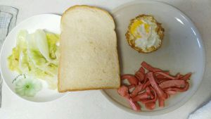 烧开锅后,不放油,放入方片面包关火,烘微黄,反面亦然。煎蛋,火腿肠部分切条状,部分切圆形爆香,小白菜白灼备用。