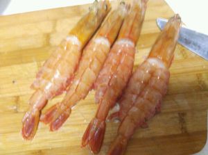 虾处理一下,虾须,内脏线都去掉。虾头上有一片枪头一样的东西,剪掉就可以把虾头里的东西处理干净了。一定要处理干净要不影响口感,会是苦味的。