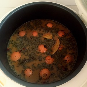 将煮好的鸡蛋捞出,锅中热水倒掉,鸡蛋适当敲出裂纹,重新放入电饭煲中,并重新加入清水(这里的清水不必加太多,没过鸡蛋三分之二即可)
