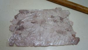 将肉块入保鲜袋中,用擀面棍敲打肉块,使肉块变成肉片,组织变得松散