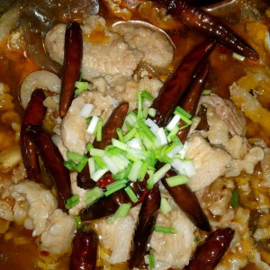 下肉片烫一下铺在白菜上面,放上辣椒。再烧热一点油浇在上面即可