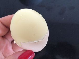 激过冷水后,剥去鸡蛋皮,看见没,蛋清不见了,鸡蛋变成了奶油黄