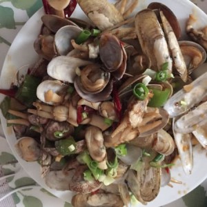 焯好的蛏子花蛤捞出来备用,此时干锅倒上油放入辣椒蒜片姜末青椒红椒等爆炒,炒的有香味时把蛏子们倒入锅中翻炒,倒入酱油稍许料酒,翻炒一下出锅前撒点盐和葱末即可出锅!