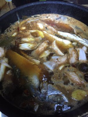 然后倒入啤酒,再把鱼和肥肉进去。大火烧开后转小火慢炖两个小时。放点肥肉是为了鲅鱼更香。