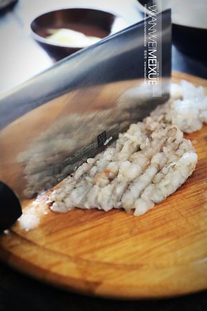虾仁用刀背粗剁成虾蓉,不必剁的太碎;