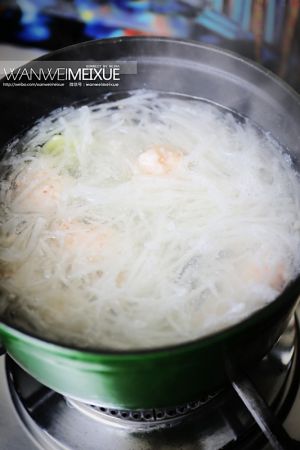 另起锅加水烧开,放入姜片、萝卜丝煮至沸腾后加入虾丸小火慢炖10分钟。
