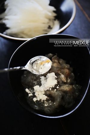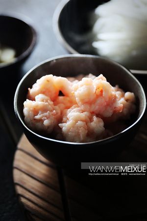 虾蓉加入适量蛋清、料酒、盐、淀粉用力搅拌,用筷子顺时针拌至虾蓉上劲;