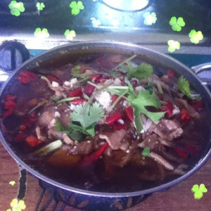 将煮熟的肉片和汤一起倒入刚刚的油菜酒精锅里,上面放川椒蒜瓣,