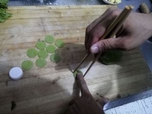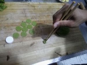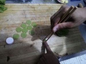 把面团擀成薄面片,用矿泉水瓶盖切成圆片