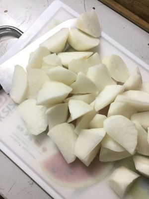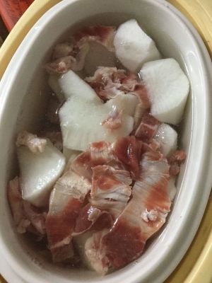 把萝卜、牛筋放入炖盅,倒入开水。炖盅外面再倒入需要量的热水。