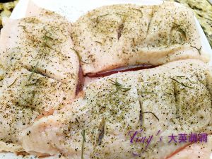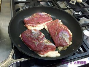 鸭胸肉解冻后用厨房纸巾吸干净水分,在鸭皮那一边浅浅划几个刀口子,然后均匀撒上海盐,黑胡椒,迷迭香。肉的那一边不要划刀口,仅仅撒上海盐,黑胡椒,迷迭香就可以了。稍稍腌制5-10分钟。