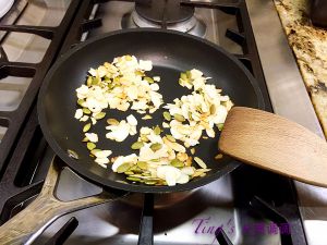 把杏仁片和南瓜仁混在一起,放在平底锅里慢火烤热,闻到香味并且看到果仁稍稍有点金黄色为止,最好不要太焦了。好了装进碗里放一边备用。