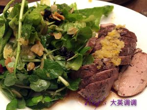 摆成自己喜欢的造型,在鸭胸上面淋上橙汁酱,上菜咯!