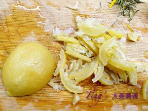 腌柠檬对半切开,全部汁液跟香橙汁喝柠檬汁混一起。腌柠檬全部切成细条,一半跟香橙皮和柠檬片放一起,一半跟薄荷叶欧芹叶放一起备用。
