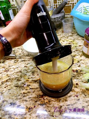 把香橙皮柠檬片放在搅拌机里,加上香橙汁柠檬汁,加上4勺橄榄油,再轻轻撒点海盐和黑胡椒,搅拌。尝尝味道,海盐和黑胡椒放到满意为止。好了放一个碗里,备用。