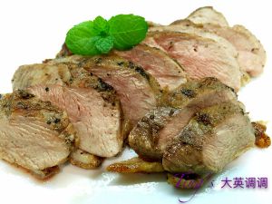 腌好了鸭肉,放在平底锅里猛火煎。鸭皮那一面先煎,会出来很多很多油,起码去掉两趟油之后翻过来煎肉的一面,3分钟。好了放在烤箱盘里,皮朝上,180度最少10分钟。差不多好了的时候放一个大的菜盘在微波炉里80度烤1分钟,把好了的鸭胸肉放在这个热好的菜盘里透气。