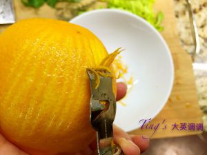 腌制鸭肉的时候,把半只香橙的皮拉出来,如图。半只柠檬的皮也拉出来。放一起。拉的时候不要拉的太深,表皮下面的一层有点苦味。