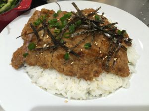 调好酱汁后将猪排切块儿盖在米饭上.撒上海苔碎和白芝麻即可.酱汁可以浇在猪排上也可以沾食.
