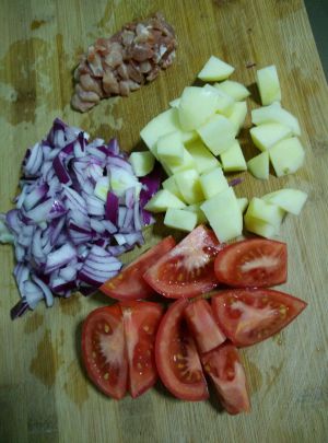 西红柿、土豆、洋葱、肉冼净切块