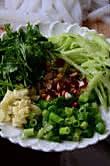 黄瓜去皮切丝,香菜洗净切段,葱花洗净切小段,蒜拍碎切碎,花生米拍碎