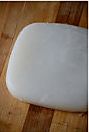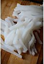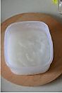 放入冰箱冷藏2小时以上,凉粉糊凝固成块状之后,倒扣在案板上