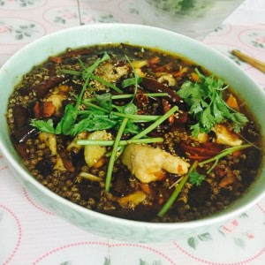 开火 热锅 小火 放油 加入红辣椒 花椒 麻椒别太热 要不辣椒糊了 煸出香味放豆瓣酱 然后放鱼片and鱼排 再放姜蒜片 加水 水沸了加一点酱油 糖 胡椒粉 最后放盐和鸡精 咕嘟咕嘟关火 倒进铺好蔬菜的大碗里