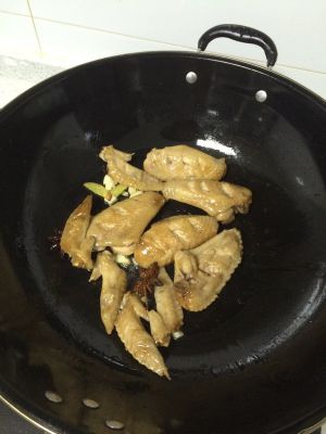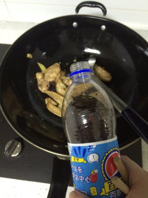 加两勺料酒,倒入可乐(因为可口可乐较之较甜,所以我选的百事),可乐的量是没掉鸡翅,倒入三勺酱油。