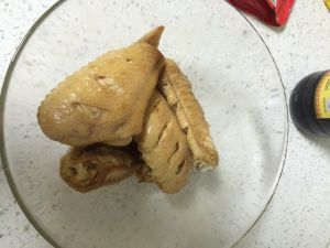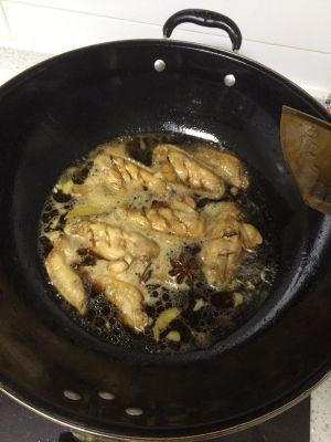 鸡翅洗净划刀,水中加入黄酒、生姜焯一下鸡翅。洗去沫和血块,晾干。