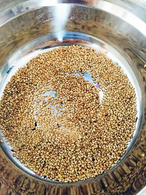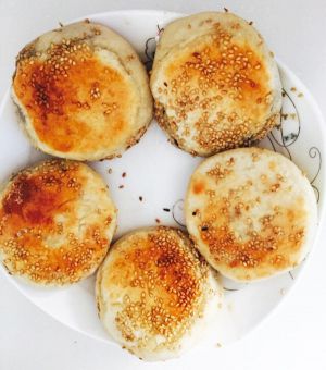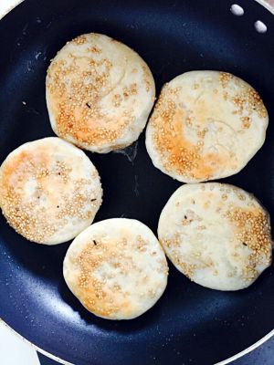 揉好的豆沙饼蘸上适量芝麻,放入刷过底油的平底锅中。