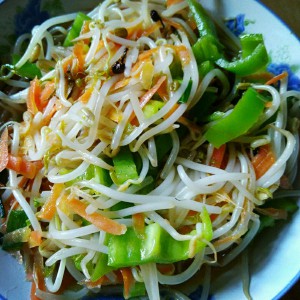 炒瓢加油放花椒炝一下,捞出,放入葱段,放豆芽,红萝卜翻炒,加入白醋,十三香,盐,翻炒一分钟放适量白糖,加入大辣椒,翻炒几下,好啦可以出锅啦,宝宝也爱吃