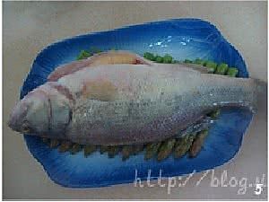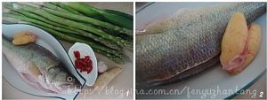 将鱼放在芦笋段上,鱼腹内纳入葱、姜丝和蒜茸,鱼身均匀摸上盐,腌制20分钟。