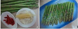 芦笋洗净,大葱、姜切丝,蒜剁茸,枸杞泡发洗净备用。芦笋切成适合的长段,码入盘中。