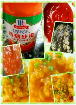 锅中放少许的油,倒入蒜未炒香后,再倒入番茄酱,糖、盐、白醋适量的水,汤汁烧开后加入少许的水淀粉,烧至汤汁浓稠时,关火,将芡汁淋到鱼花上即可。