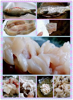草鱼三斤左右1条宰杀去头、去鳞,沿脊骨剃下鱼肉一块,剃掉鱼的大刺,修平鱼肉,剃掉鱼的薄边。取净鱼肉备用,先用斜刀的方法将鱼肉切成薄片,深及鱼皮,约5刀后切断,然后切成细条状,深及鱼皮别切断。处理好的鱼片组,用盐、料酒、大葱叶腌渍15分钟左右,洗净沥干水分,用厨房纸吸干水分后待用。用一个小的不锈钢盘,里面放较多的淀粉。用两只手捻起打了花刀的鱼块,将干淀粉均匀的沾到鱼块的上面,注意每个部位都要沾到(每个细条都要裹满哦),淀粉粘好后,用手轻轻的抖动一下,把多余的干淀粉抖下来。