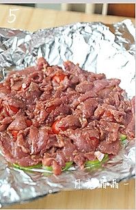把腌制好的里脊肉平铺在蔬菜上,把锡纸对角盖起来,包好。(注意锡纸包内食材保持平铺状态)