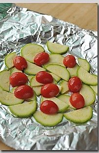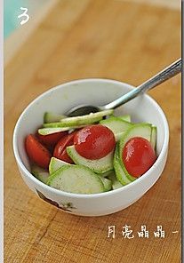 西葫芦刷洗干净,连皮对半切开,再切成薄片,小番茄洗净对半开。用一点点生抽、黑胡椒粉和橄榄油拌匀。