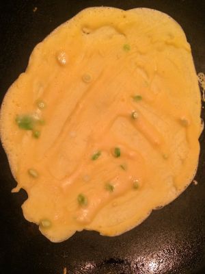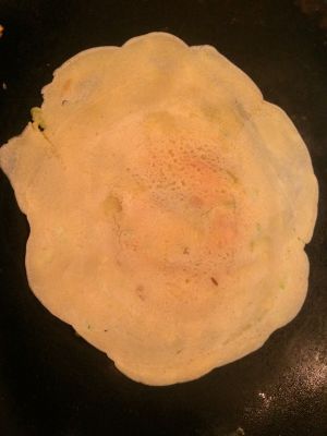 将一勺面倒入锅中,放小火,摊匀,锅上抹一小层油