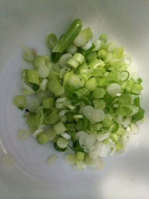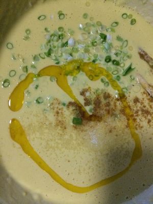 鸡蛋液加一碗水,将面粉和好,加入葱花,盐,花椒面,倒几滴油,避免粘锅,再次搅拌均匀