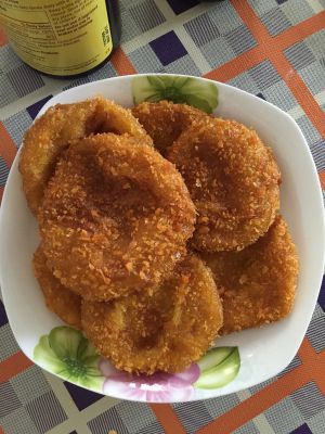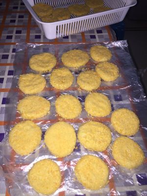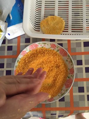 分成小团状稍压扁沾上面包糠,也可以用椰蓉