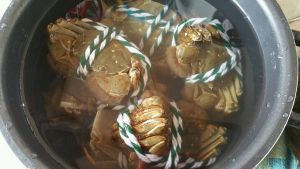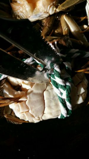 螃蟹换水后,水里加入半瓶子白酒,想把它们醉倒,可惜三个小时后它们还不醉,还一个个挣脱了绳子,使劲往外爬!没办法,我只能手忙脚乱的戴着厚手套把越狱的螃蟹翻个,在正中央扎一刀,好歹管用!