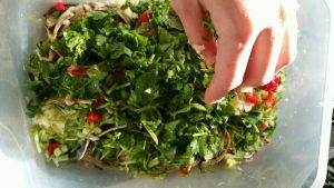 趁这个功夫准备其他的.香菜根不要丢,香菜的美味都在根部,用牙刷仔细刷洗干净,切段!