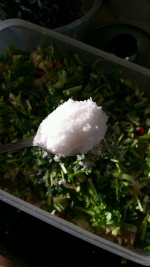 用筷子搅拌均匀后,尝尝咸淡,味道偏淡就再加入适当盐,我加了三勺,想做的咸点!