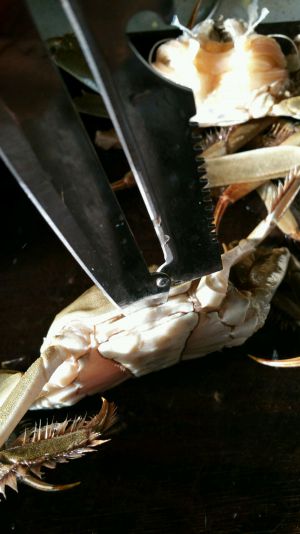 再以防万一,先把螃蟹钳子拧下来,额(⊙o⊙)….用刀对着螃蟹下段把壳撬开!