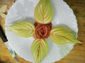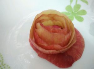 削好的苹果皮卷起来,做一朵玫瑰花样。