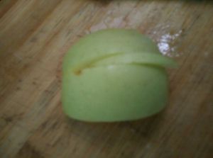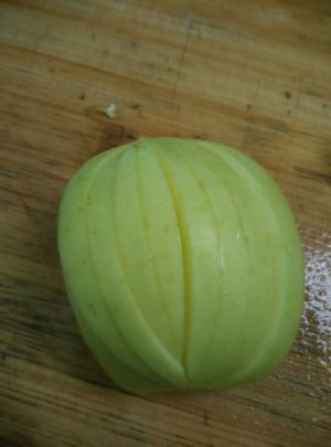 全部切好后如图,四瓣青苹果可做四片绿叶。