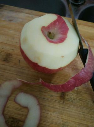 红苹果洗净,然后如图削皮,尽量不要断,连着削到底。