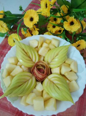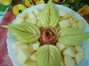 摆盘,红苹果花样做花心,青苹果做绿叶。
