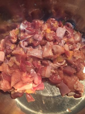 把鸡腿和鸡胸脯肉切成小块,用盐,料酒,生抽腌制10多分钟