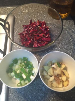 准备辅料,根据自己喜好辣椒和花椒的成度可以自己增减,葱,蒜,姜准备待用